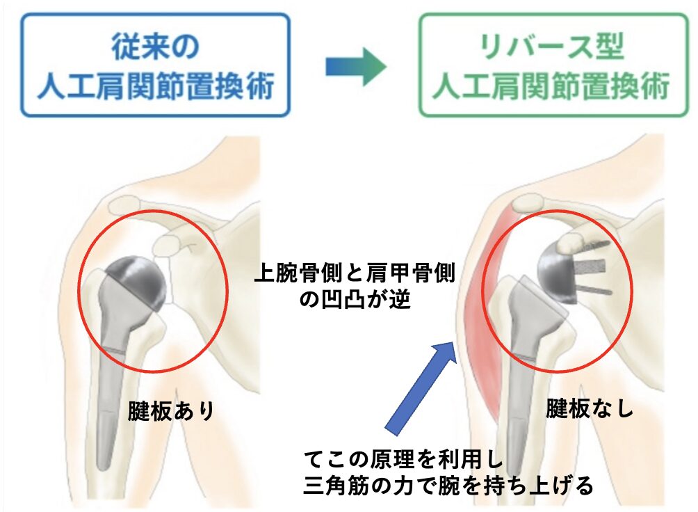 | 項目 | 人工肩関節全置換術 (TSA) | リバース型人工肩関節 (RSA) |