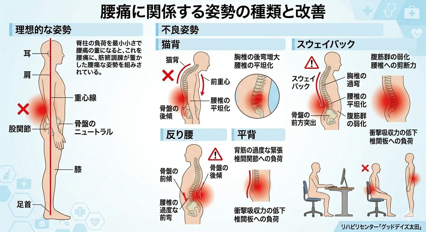 姿勢の崩れは、腰椎への負荷を劇的に増加させます。代表的な2つのパターンを見てみましょう。