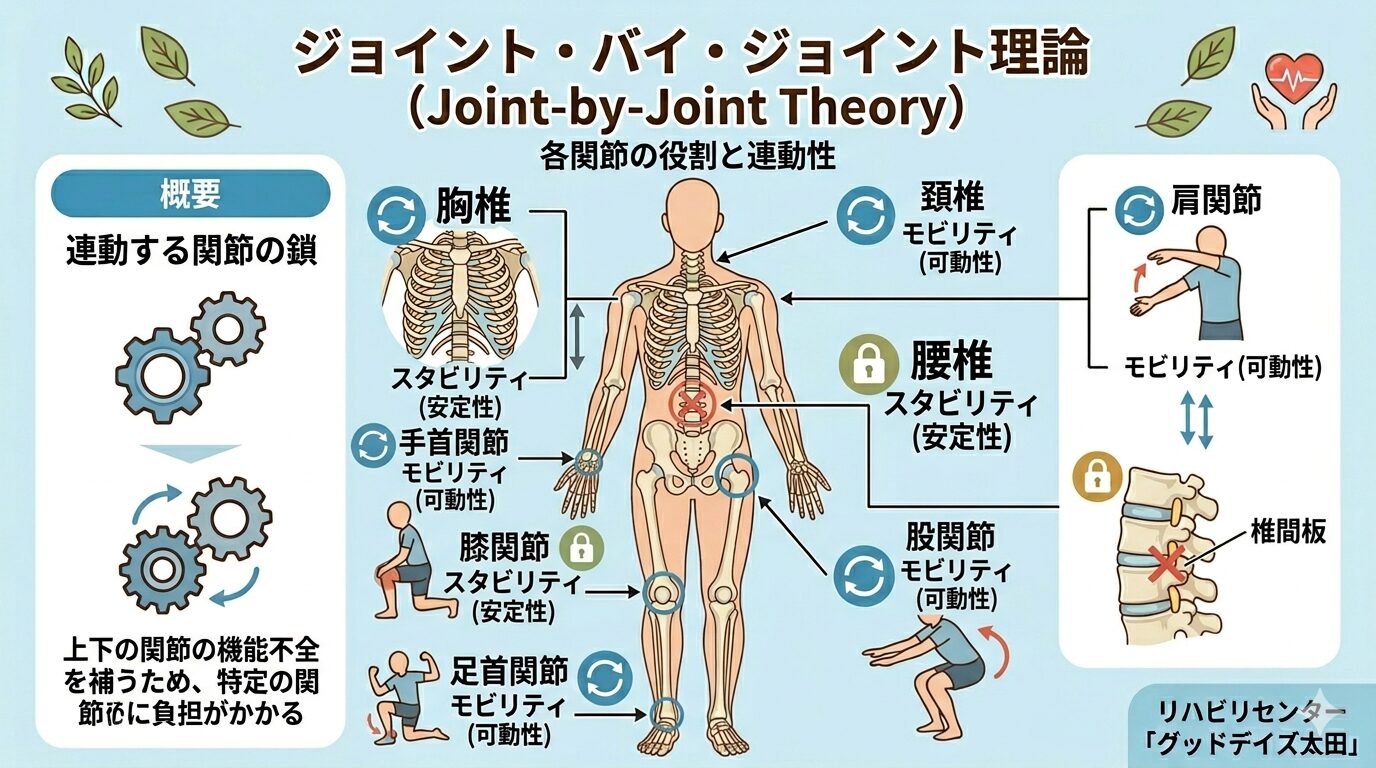 理学療法において重要な概念に、「ジョイント・バイ・ジョイント・セオリー」があります。これは、体内の各関節には「動きを出すべき関節(モビリティ)」と「固定すべき関節(スタビリティ)」が交互に配置されているという考え方です。