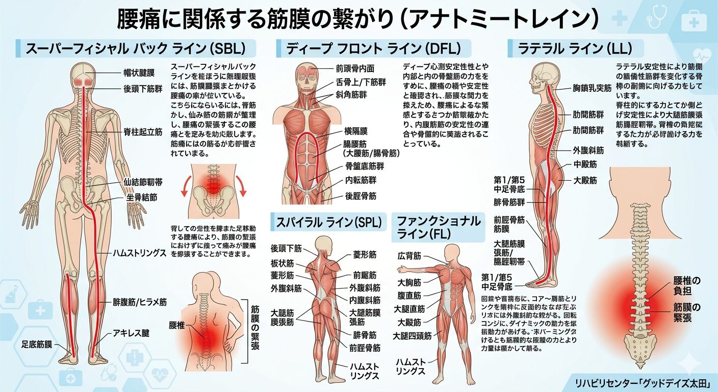 頭から足の裏まで体の背面を走る筋膜のラインを「スーパーフィシャル・バック・ライン」と呼びます。例えば、ふくらはぎの筋肉が硬くなると、このラインを通じてお尻や腰の筋膜が引っ張られ、腰痛を引き起こします。